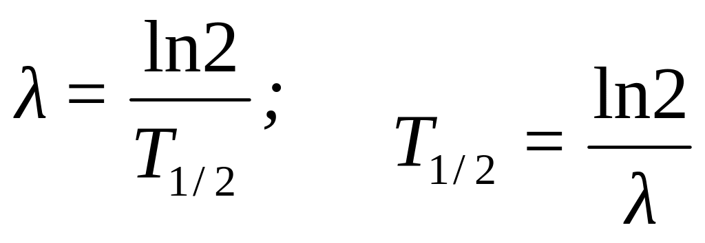 3)Период полураспада. Промежуток времени, в течение которого число нераспавшихся ядер уменьшается от N0 до ½N0, называется периодом полураспада Т1/2. Этот показатель связан с постоянной распада соотношениями: