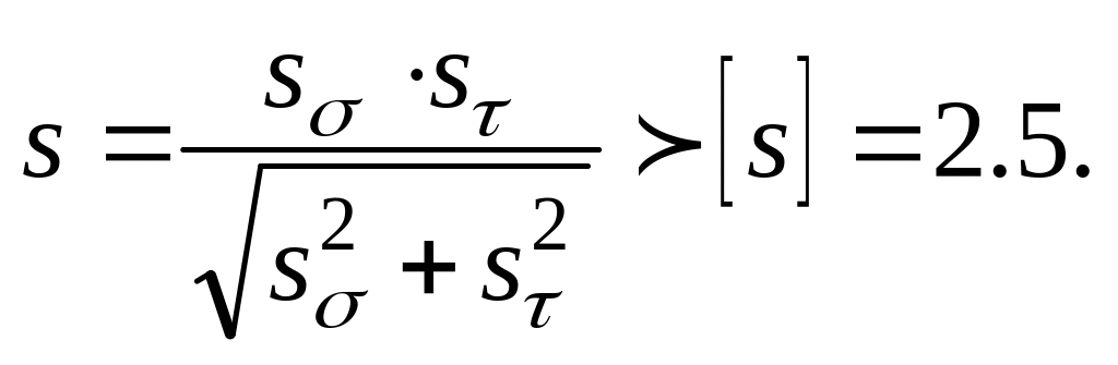 21. Производим проверку вала на кратковременную перегрузку по крутящему моменту. Пиковая нагрузка предполагается случайной, действующей ограниченное число раз и равной двукратной номинальной. Наибольшие напряжения изгиба и кручения в опасном сечении при кратковременной перегрузке следующие: