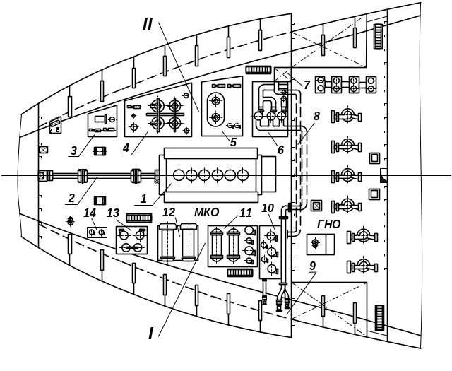 - в нос - помещение лага и эхолота, коридор трубопроводов;