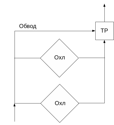 Если пресная вода или масло не достигли соответственно 91,15 и 50 град. С, то они частично идут мимо холодильника и подмешиваются к охлажденным жидкостям для достижения требуемых температур 75 и 43 град соответственно. Ввиду большей поверхности принятых теплообменников, чем расчетные, часть рабочих тел будет постоянно проходить мимо холодильника под действием терморегулятора ТР, установленного на выходе.