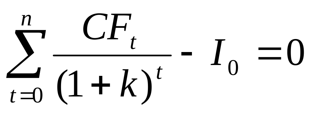 Формально IRR определяется как тот коэффициент дисконтирования, при котором NPV равна нулю, т. е. инвестиционный проект не обеспечивает роста ценности фирмы, но и не ведет к ее снижению.