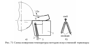 Искусственной называется термопара, у которой оба элемента искусственно вводятся в инструмент или заготовку для измерения температуры. Для измерения температуры, например, при токарной обработке (рис.71), в корпусе резца 1 сделано отверстие (рис.71,а), в которое вставлена термопара 2 (рис.71,б), подключенная к показывающему прибору 3. Спай термопары регистрирует температуру в режущем клине инструмента на некотором расстоянии от передней поверхности.