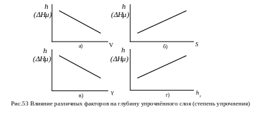 Влияние различных факторов на глубину упрочненного слоя (h) и степень упрочнения () показано на рис.53.