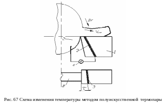 Полуискусственной называется термопара, один из элементов которой естественно присутствует в процессе резания, а другой искусственно вводится или в инструмент или заготовку для измерения температуры. Данной термопарой можно получать температурные поля в режущем клине инструмента, определять локальные и контактные температуры (температуры на передней и задней поверхностях).