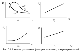 На высоту реальных микронеровностей оказывают влияние те же факторы, что и на высоту расчетных неровностей (рис.51). Поэтому при уменьшении подачи (толщины срезаемого слоя) (рис.51,б), углов в плане инструмента (рис.51,в) и увеличении радиуса при вершине инструмента величина неровностей уменьшается. Кроме того, на высоту неровностей влияют факторы, которые изменяют объем пластического деформирования материала и условия трения на контактных поверхностях инструмента. К ним можно отнести механические свойства обрабатываемого материала, скорость резания и свойства применяемой смазочно – охлаждающей жидкости (СОЖ). Глубина резания (ширина срезаемого слоя) и передний угол инструмента на высоту неровностей значительного влияния не оказывают. С увеличением твердости и прочности обрабатываемого материала и снижением его пластичности объем пластической деформации уменьшается, и это приводит к уменьшению высоты неровностей. При обработке заготовок из материала не склонного к наростообразованию с увеличением скорости резания высота неровностей уменьшается. Это связано с уменьшением объема пластической деформации и среднего коэффициента трения (рис.51,а, кривая 1). Если обрабатываемый материал склонен к наростообразованию, то высота неровностей находится в прямой зависимости от высоты нароста. В зоне наростообразования высота неровностей возрастает с увеличением высоты нароста, затем снижается по мере уменьшения высоты нароста, а после исчезновения нароста продолжает непрерывно снижаться (рис.51,а, кривая 2). Применение СОЖ, снижающих средний коэффициент трения, вызывает снижение высоты неровностей. С повышением износа инструмента по задней поверхности средний коэффициент трения возрастает и высота неровностей увеличивается (рис.51,г).