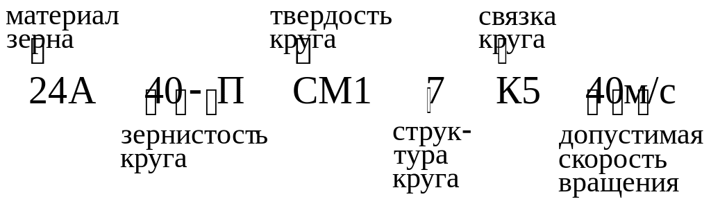 Маркировка шлифовального круга. В маркировку шлифовального круга входит: форма и размеры круга, характеристика круга, допустимая скорость вращения круга, классы неуравновешенности и точности круга. Ниже приведен пример маркировки шлифовального круга.