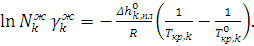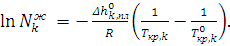 Твердые растворы образуют компоненты, близкие по химическим и физическим свойствам и имеющим одинаковый тип кристаллической решетки. Если компоненты в твердой фазе не растворимы друг в друге, то из жидкого раствора выделяются кристаллы чистого вещества. В этом случае имеет место равновесие: жидкий двухкомпонентный раствор и кристаллы одного из компонентов (Nkтв =1, γkтв =1), а уравнение принимает вид