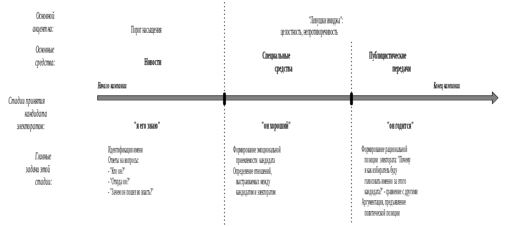 - •4.1.Стадии принятия кандидата электоратом в ходе избирательной кампании