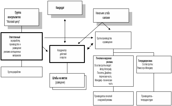 Связи между всеми подразделениями обосновываются выполняемыми функциями. В Группе консультантов выделяется ответственный за разработку, производство и размещение рекламы. Под его непосредственным руководством, с установленным бюджетом, находится Группа разработки, в обязанности которой входит создание оригинал-макетов печатной продукции, литературных и режиссерских сценариев теле- и радиороликов. Такое взаимодействие, как показывает практика избирательных кампаний последних лет, наиболее эффективно. Ответственный от Группы консультантов ставит задачу разработчикам, проводит оценку готовых оригинал-макетов, контролирует их передачу в производство.
