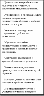 1. Принцип модульности. Данный принцип предполагает цельность и завершённость, полноту и логичность построения единиц учебного материала в виде блоков – модулей, внутри которых учебный материал структурируется в виде системы учебных элементов.