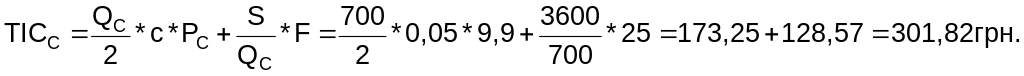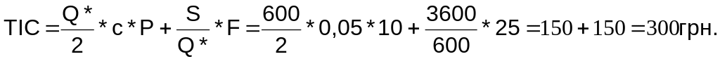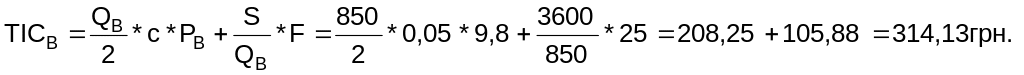 Увеличение расходов на поддержание запасов TICВ=314,13-300=14,15 грн. в год. Чистая экономия составляет 720-14,13=705,87 грн. в год.