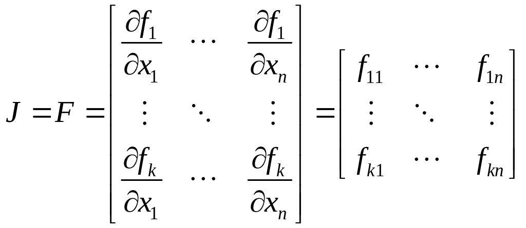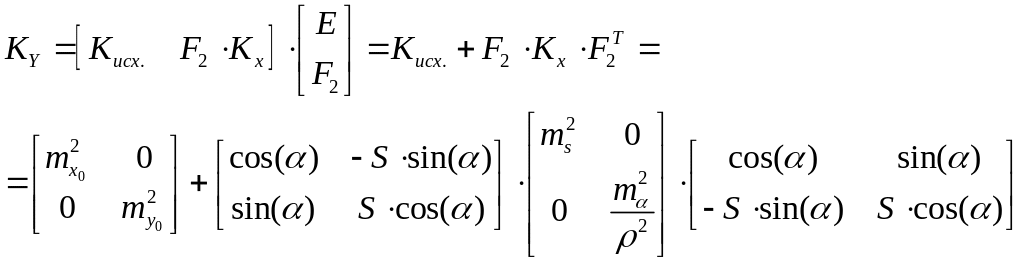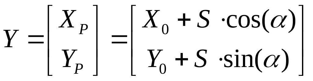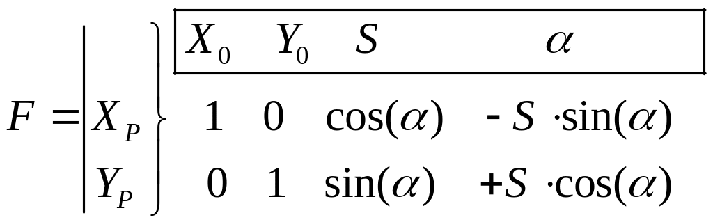 и матрицу Якоби F размера 2х4 (две функции XP, YP и четыре аргумента по которым берут производные – X0, Y0, S и )