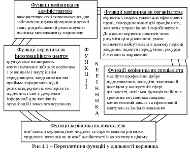 У діяльності керівника тісно переплітаються функції адміністратора, організатора, спеціаліста, інформаційного центру, вихователя (рис.4.1.).