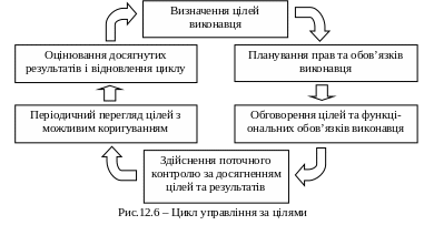 Процедуру управління за цілями можна подати у вигляді певного циклу (рис.12.6). Зі схеми видно, що цикл управління за цілями охоплює 6 етапів, які в сукупності дають керівникові можливість оцінити роботу підлеглих.