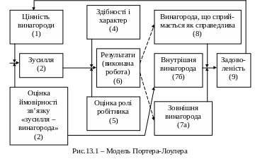 Сутність моделі Портера – Лоулера полягає в тому, що модель являє собою комплексну теорію мотивації і включає в себе елементи теорії очікувань і теорії справедливості (рис.13.1).