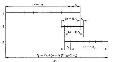 2) Параллельное движение (В). Характеризуется тем, что одновременно все операции выполняются над разными единицами партии продукции одного наименования, каждая такая единица проходит через все операции технологического процесса непрерывно и независимо от остальных единиц. Передача единиц продукции с операции на операцию осуществляется по несколько штук (передаточной или транспортной партией/?, меньшей п), или по одной штуке. Поэтому время движения партии продукции по всем операциям технологического процесса 7^.g минимально и равно: