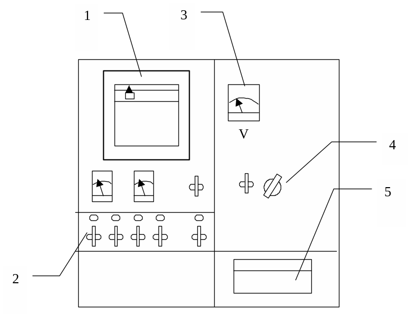 Лабораторная установка включает в себя щит контроля и управления и объект управления, представленный электронным имитатором динамики. Внешний вид установки представлен на рис. 1. На левой панели щита контроля и управления установлены: потенциометр 1 типа КСП-4И и тумблеры 2 подачи питания, включения ЭИД (“ЭИД”), включения возмущения на ЭИД (“ВОЗМУЩЕНИЕ”), сброса возмущения и перевода ЭИД в начальное состояние (“СБРОС”), а также соответствующие им светодиодные индикаторы. На правой панели расположены: вольтметр 3 для контроля величины возмущения, тумблеры 4 включения задатчика и переменное сопротивление для установки величины задания. В нижней части правой панели, в закрытой нише, установлены ЭИД 5 и тумблеры подключения ЭИД к потенциометру.