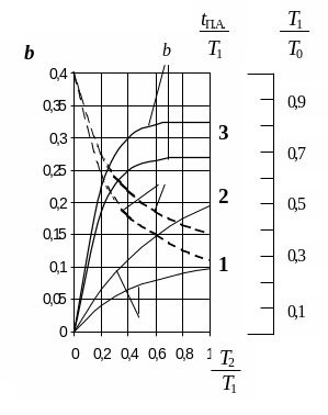 от точек пересечения провести горизонтальные прямые и считать по соответствующим шкалам величины соотношений Т1/Т0 и tП.А./Т1;