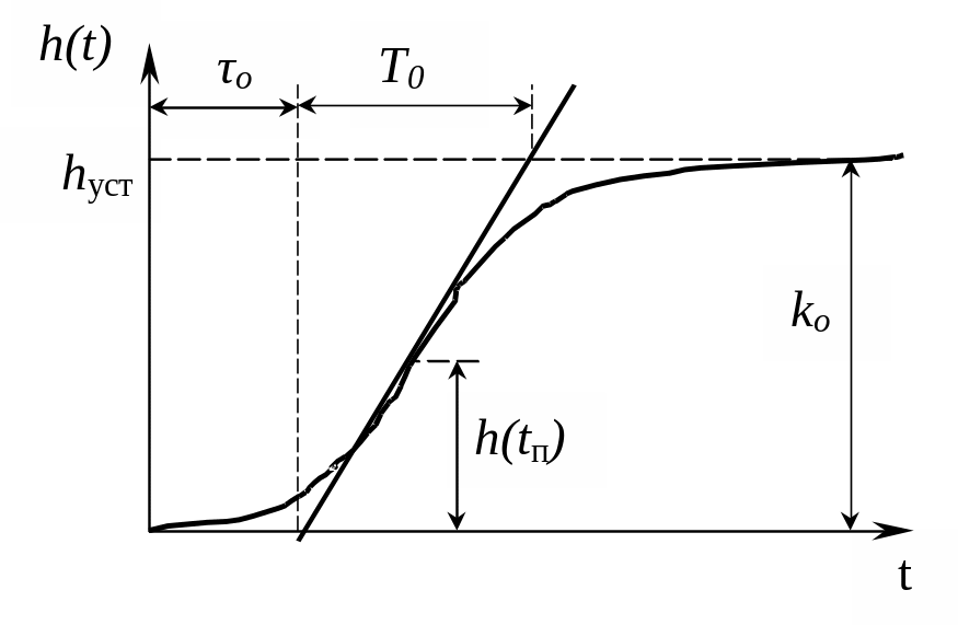 Для определения коэффициентов передаточной функции (kО, ТО, О) на графике переходной характеристики проводят касательную в точке перегиба (приближенно) (рис. 2).