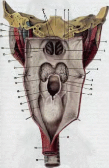 ха;7-хоана;8-трубно-небнаяскладка;9-глото•rноеустьеслуховойтрубы:10-носоглоточная(глоточная)миндалина;11-глоточныйкuрман;12-трубныйвалик;13-дужкаатланта(1шейногопозвонка);14-носоглотки;15-трубно-глоточнаяскладка;16-язычокмягкогонеба;17-небно-язычковаяскладка(передняянебная);18-небнаяминдалина:19-небно-глоточная(задняянебная)дужка;20-ротоглотка;21-надгортанник;22-гортаноглотка;23-перстневидныйхрящ;24-пищевод;25-трахея;26-щитовидныйхрящ(областьуглаадамоваяблока);27-полостьгортани;28-телоподъязычнойкости;29-челюстно-подъязычнаямыщuа;30-подбородачноподъязычнаямыщuа;31-подбородочна-язычнаямыщuа;32-преддвериерта;33-полостьрта;34-нижняяносоваяраковина;35-средняяносоваярnковина;36-лобнаяпазуха.
