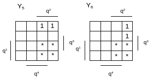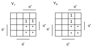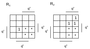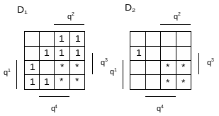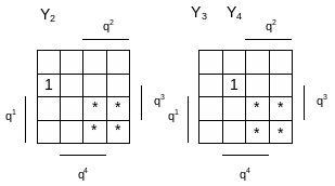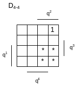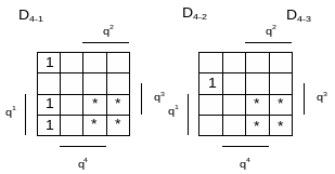 Для окончательной минимизации функций используется метод Карно. При минимизации следует учесть, что все функции являются не полностью определенными, так как в таблице переходов не использованы состояния Q12, Q13, Q14, Q15.