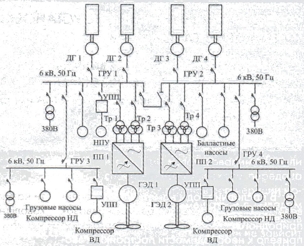 Рис. 4.18. ЕЭЭУ с двухтопливными главными двигателями: ПП — полупроводниковый преобразователь; Тр — трансформатор