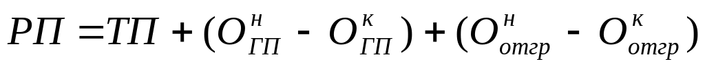 Под реализованной продукцией понимается продукции, которая отгружена покупателю и уплачена. РП рассчитывается на основе ТП, нормативных и отчетных данных о запасах ГП, ПФ на складах предприятия, остатков товара в пути на начало и конец планового периода.