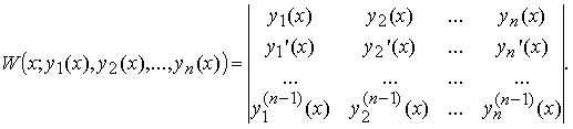 Определителем Вронского W(x; y1(x), y2(x), ..., yn(x)) называется определитель, первая строка которого образована функциями y1(x), y2(x), ..., yn(x) из Cn-1[a, b] , а последующие строки образованы производными от функций предыдущей строки: