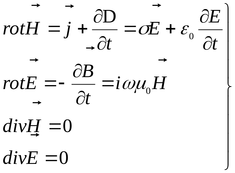 При описании математической модели магнитотеллурического поля пользуются низкочастотным, квазистационарным приближением. Но начать следует с рассмотрения полной модели, учитывающей токи смещения. В среде с параметрами ε, μ и σ электромагнитное поле описывается уравнениями Максвелла в следующем виде