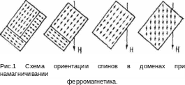 Под влиянием внешнего магнитного поля происходит намагничивание ферромагнитного материала. При этом растут объёмы доменов, магнитные моменты которых составляют наименьший угол с направлением напряженности поля –H , и магнитные моменты всех доменов ориентируются по направлению вектора. Схема ориентации магнитных моментов доменов при намагничивании ферромагнетика показана на рис.1.