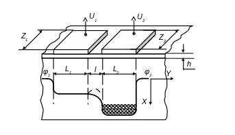 В процессе перехода зарядового пакета поверхностный потенциал под первым затвором φ1 повышается, а под вторым затвором φ2 понижается. Может возникнуть потенциальный барьер (штриховая линия на рис. 1), препятствующий полной передаче заряда. Поэтому для полной передачи зарядов необходимо численно решить уравнение Пуассона, определяющее распределение потенциалов. Для этого необходимо решить одномерную задачу в предположении, что поверхностная область полупроводника в зазоре между элементами полностью обеднена. Тогда распределение потенциала может быть описано одномерным уравнением вида: