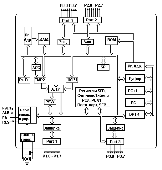 Микроконтроллер семейства 8051 имеют следующие аппаратные особенности:
