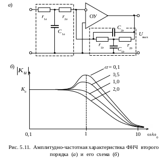 Амплитудно-частотная характеристика ФВЧ первого порядка приведена на рис. 5.12, б. На частоте среза фильтра коэффициент передачи фильтра достигает значения 0,707К0.