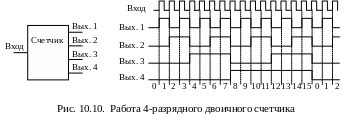 Счетчики представляют собой более высокий, чем регистры, уровень сложности цифровых микросхем, имеющих внутреннюю память. Хотя в основе любого счетчика лежат те же самые триггеры, которые образуют и регистры, но в счетчиках триггеры соединены более сложными связями, в результате чего их функции сложнее, и на их основе можно строить более сложные устройства, чем на регистрах. Точно так же, как и в случае регистров, внутренняя память счетчиков оперативная, то есть ее содержимое сохраняется только до тех пор, пока включено питание схемы. С выключением питания память стирается, а при новом включении питания схемы содержимое памяти будет произвольным, случайным, зависящим только от конкретной микросхемы, то есть выходные сигналы счетчиков будут произвольными. Как следует из самого названия, счетчики предназначены для счета входных импульсов. То есть с приходом каждого нового входного импульса двоичный код на выходе счетчика увеличивается (или уменьшается) на единицу (рис. 10.10).