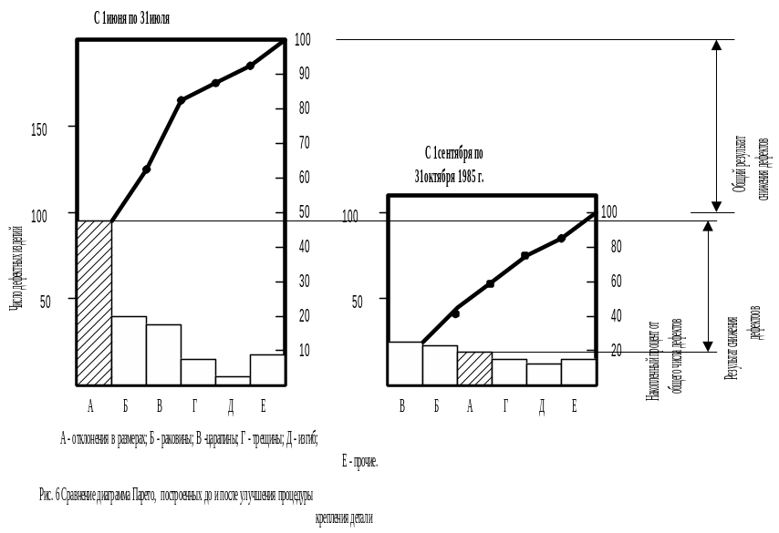 После внедрения усовершенствованной процедуры установки детали собрали данные и построили диаграмму Парето, чтобы сравнить результаты. Две диаграммы, см. рис. 6 явно показывают уменьшение числа дефектов в размерах.