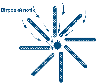 Різновидом вітроустановок з вертикальною віссю є так звана вітрова гребля, де сконцентрований повітряний потік спрямовується на установку за допомогою напрямлювачів у вигляді лісосмуг, штучних перегородок у вигляді панелей, надувних конструкцій, солом'яних блоків тощо. Схему вітрової греблі наведено на рис. 3.4.