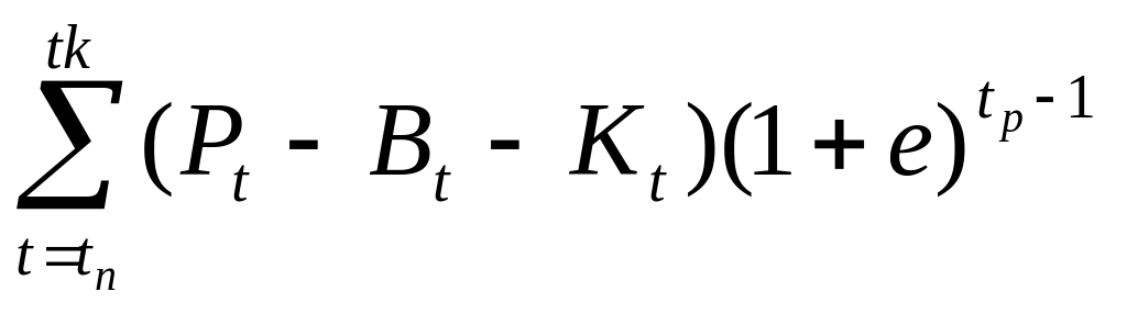Сума величин (Кt—Лt) являє собою нагромаджену амортизаційну суму за період розрахунку плюс ті витрати, що не увійшли у вартість основних виробничих фондів, але відносяться до одноразових. Таким чином, в основному, вираз (1.50) відображає сумарний прибуток мінус одноразові витрати.