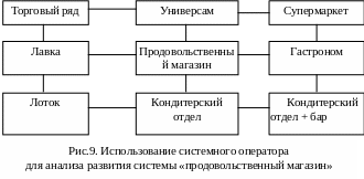 По положению системы в иерархии можно выделить надсистему, систему и подсистему. В соответствии с законами, развитие системы и ее элементов идет из прошлого через настоящее в будущее. Все вышесказанное дает возможность построить структуру, которая получила название системного оператора (рис. 8), позволяющего не только проследить историю развития системы, но и прогнозировать ее будущее. Пример использования системного оператора (СО) дан на рис. 9.