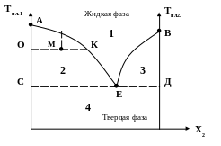 В точке пересечения Е температура плавления наименьшая, в этой точке в кристаллическое состояние переходят сразу оба компонента, в той же пропорции, в какой они находятся в жидкой фазе. Таким образом, в точке Е