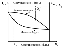 Линия солидуса (нижняя линия на диаграмме) связывает состав твердой фазы с Тпл. (рисунок 7). (На линиях ликвидуса и солидуса также возможны экстремумы. В точке экстремума составы жидкой и твердой фаз одинаковы).