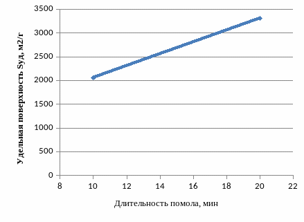 Рисунок 1.4 – Зависимость удельной поверхности от длительности помола в планетарной мельнице.