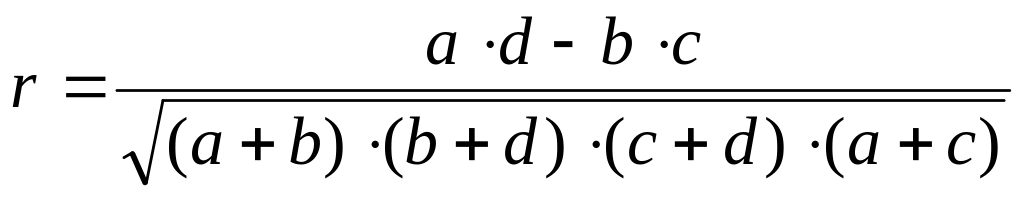 При изучении зависимости качественных признаков используется коэффициент сопряженности. Для определения тесноты связи в случае альтернативной зависимости двух сопоставляемых признаков (данные, как правило, представлены в четырехпольной таблице) коэффициенты сопряженности рассчитываются по формулам: