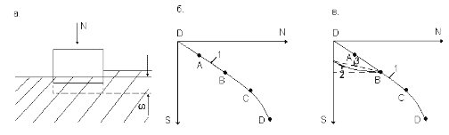 Жесткий штамп загружен нагрузкой N. В массиве грунта происходят перемещения, возрастающие с увеличением нагрузки. Грунт будет деформироваться как от собственного веса, так и от нагрузки. Интегральным выражением деформаций является осадка штампа S. При увеличении нагрузки осадка развивается в соответствии с кривой 1, приведенной на рис.3“б”. Выделяются 4 участка: ОА – соответствует нагрузке, не превышающей структурную плотность грунта Р str. При таких напряжениях развиваются упругие осадки и осадки, связанные с затухающей ползучестью. Напряжения по краям штампа будут превышать Pstr. Это фаза упругих деформаций.