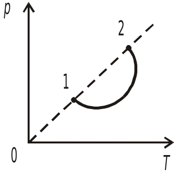 9. Идеальный газ переведен из состояния 1 в состояние 2 (см. рисунок). Отметьте, какие из следующих четырех утверждений правильные, а какие — неправильные. А. Объем газа сначала уменьшался, а затем увеличивался. Б. Объем газа сначала увеличивался, а затем уменьшался. В. V1 = V2. Г. V1 < V2. |