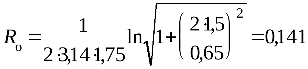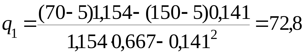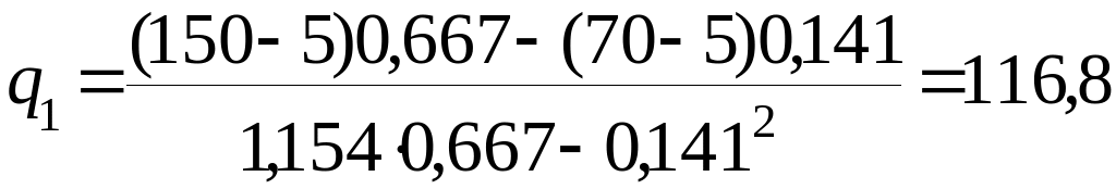 Пример 2. Определить удельные потери тепла подающего и обратного трубопроводов диаметров d1=d2=0,273 м, проложенных бесканально (pиc. 10.8) в маловлажных суглинистых грунтах на глубине h=l,5 м с расстоянием между осями труб по типовому проекту b=0,65 м. Температура в подающем трубопроводе t1=150°С, в обратном ?2=70°C. Толщина изоляции на подающем трубопроводе—0,14 м, на обратном—0,05 м. Коэффициент теплопроводности изоляции ln=0,12 Вт/м·°С. Температура грунта на глубине заложения труб to=+5°С, для этих условий коэффициент теплопроводности грунта lг=1,75 Вт/м·°С.