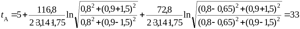 Температура грунта в точке А (рис. 10.8) при х=0,8 м и y=0,9 м по формуле (10.19) равна:
