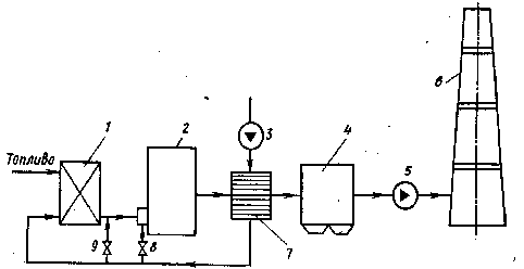 Простейшая принципиальная схема газовоздушного тракта ТЭС приведена на рис. 11.17. Воздух к котлу 2 подается дутьевым вентилятором 8, создающим необходимый напор для преодоления максимального сопротивления воздушного тракта. Причем после воздухоподогревателя 7 поток воздуха разделяется на две части: первичный, поступающий в систему пылеприготовления 1 в качестве сушильного агента и через дроссель 9 для транспортировки топлива в топку, и вторичный, направляемый через дроссель 8 непосредственно к устройствам для сжигания топлива. Продукты сгорания топлива охлаждаются в воздухоподогревателе 7, очищается от золы в золоуловителях 4 и дымососом 5 выбрасываются через дымовую трубу б в атмосферу. Удаление продуктов сгорания может в отдельных случаях производиться за счет естественной тяги дымовой трубы.