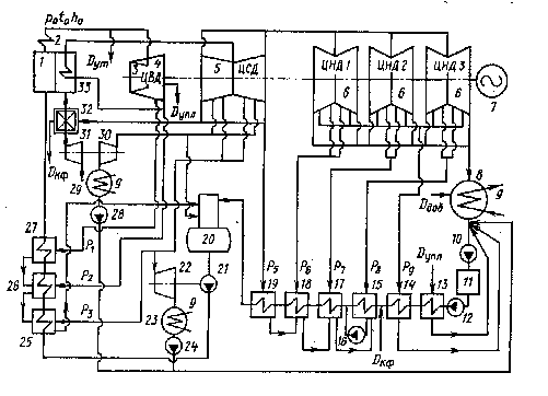 7 – циркуляционный насос; 8 – конденсатор турбины; 9 – трубопровод добавочной воды;