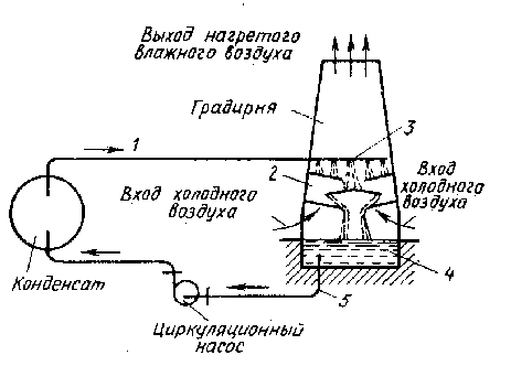 Часто в качестве охладителей в системе оборотного водоснабжения используют градирни (рис. 11.15), что позволяет повысить компактность сооружений электростанции. Бывают градирни и с искусственной тягой, где более интенсивное движение воздуха достигается с помощью вентилятора. Охлажденная вода бассейна 4, расположенного в основании градирни поступает к циркуляционным насосам, которыми прокачивается через конденсаторы и возвращается в оросительное устройство.