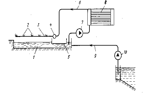 Рис. 11.14. Система оборотного водоснабжения с брызгальной установкой: